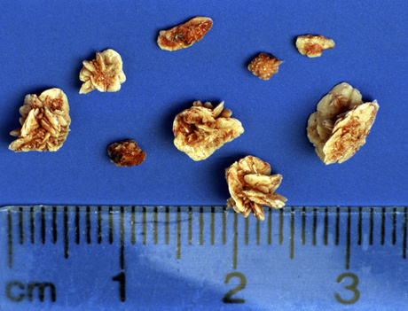 Наиболее часто встречаются камни, содержащие фосфат аммония, реже – содержащие оксалат кальция, фосфат кальция, ураты, цистин, силикаты. Около 10% камней имеют смешанный состав.