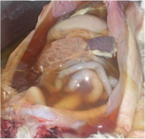 - Увеличение живота в объеме - асцит является наиболее заметным клиническим проявлением при “влажной” форме FIP. Кроме этого, выпот может образовываться в грудной и перикардиальной полости (совместно с выпотом в брюшную или изолированно), в этом случае отмечается нарушение дыхания;