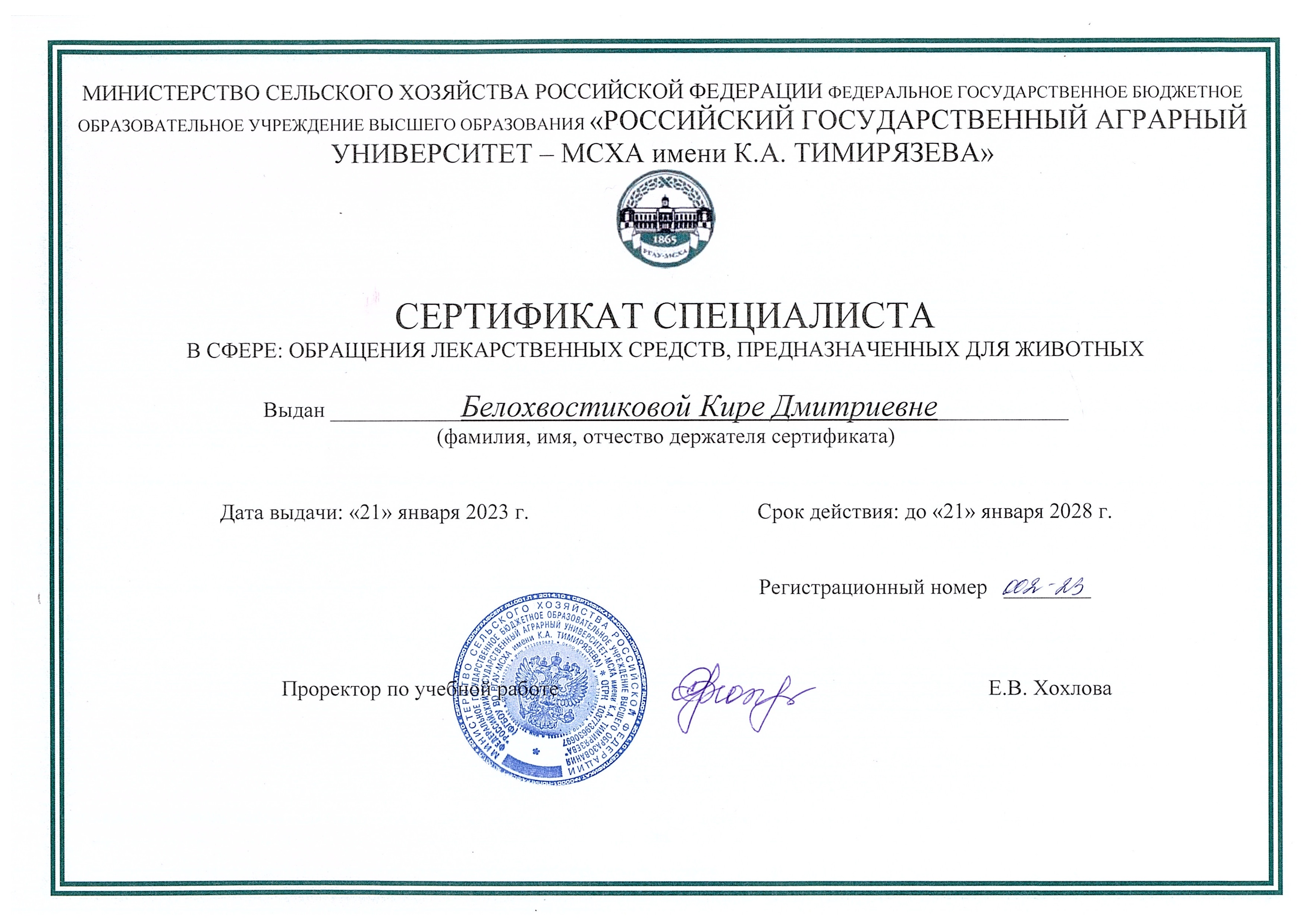 - Повышение квалификации в РГАУ-МСХА им. К. А. Тимирязева по дополнительной профессиональной программе «Правовые аспекты фармацевтической деятельности, осуществляемой организациями в сфере обращения лекарственных средств, предназначенных для животных».