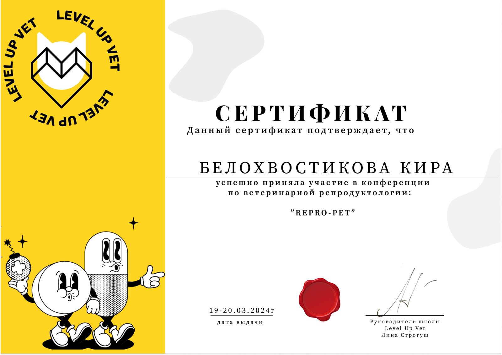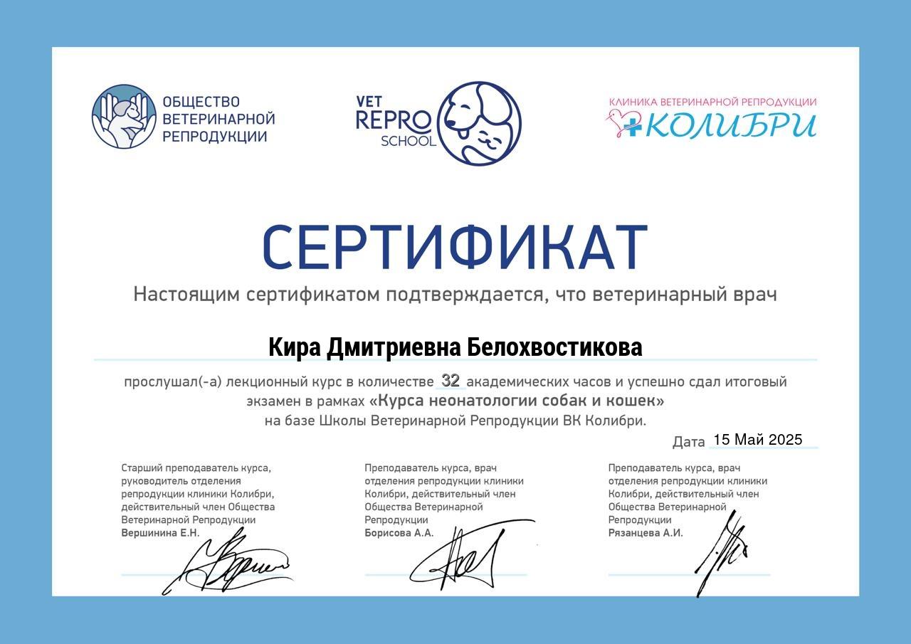 - Участник конференции по ветеринарной репродуктологии «Repro-Pet» (школа «Level Up Vet»).