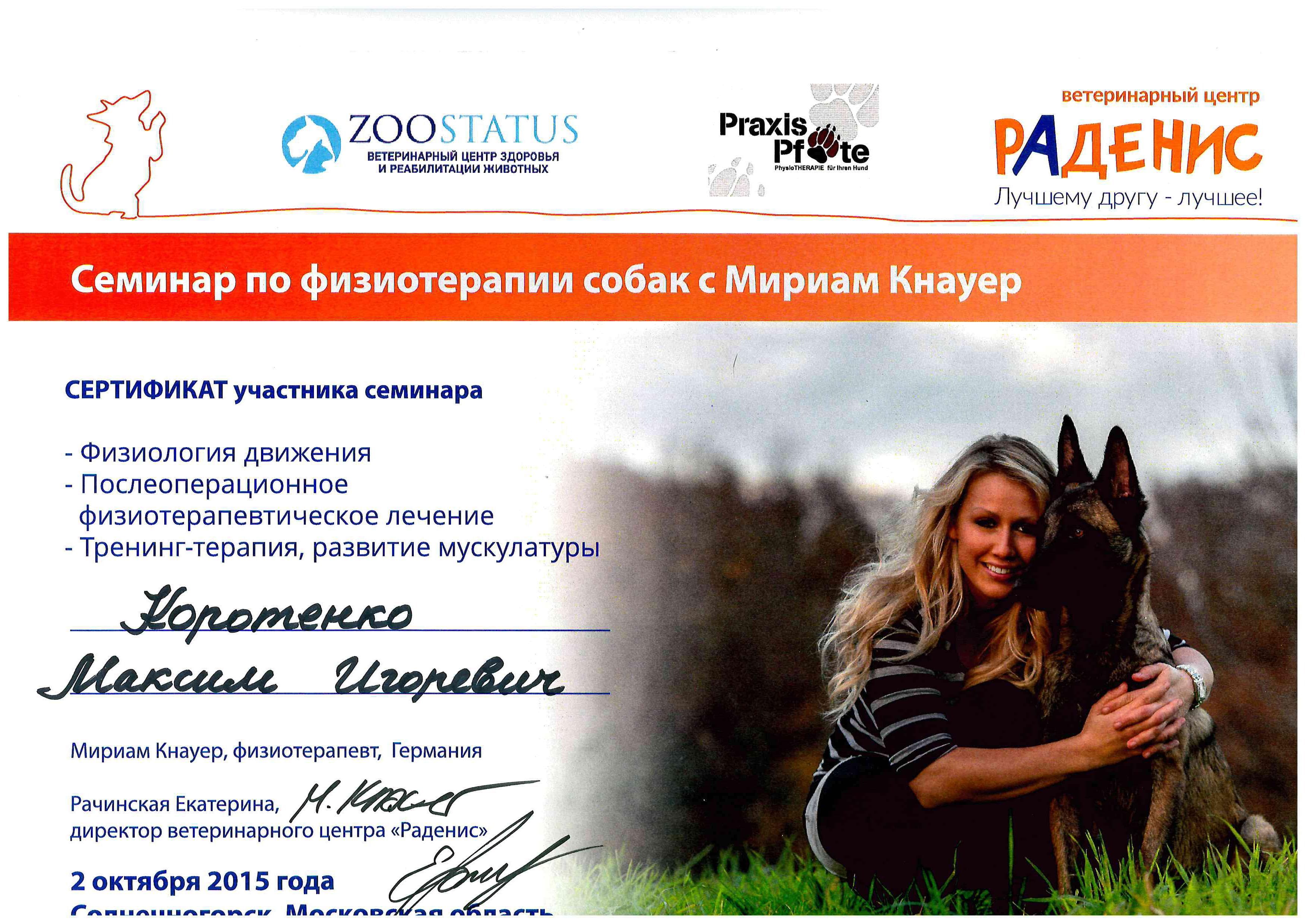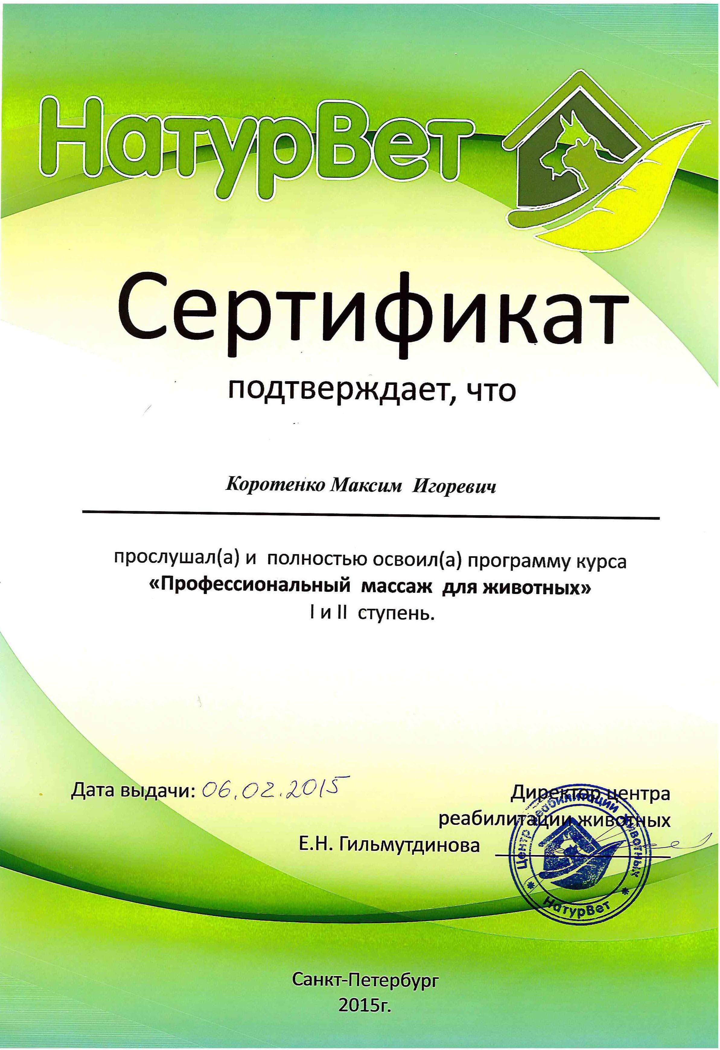 - Курс «Профессиональный массаж для животных» в центре реабилитации животных г. Санкт-Петербург.