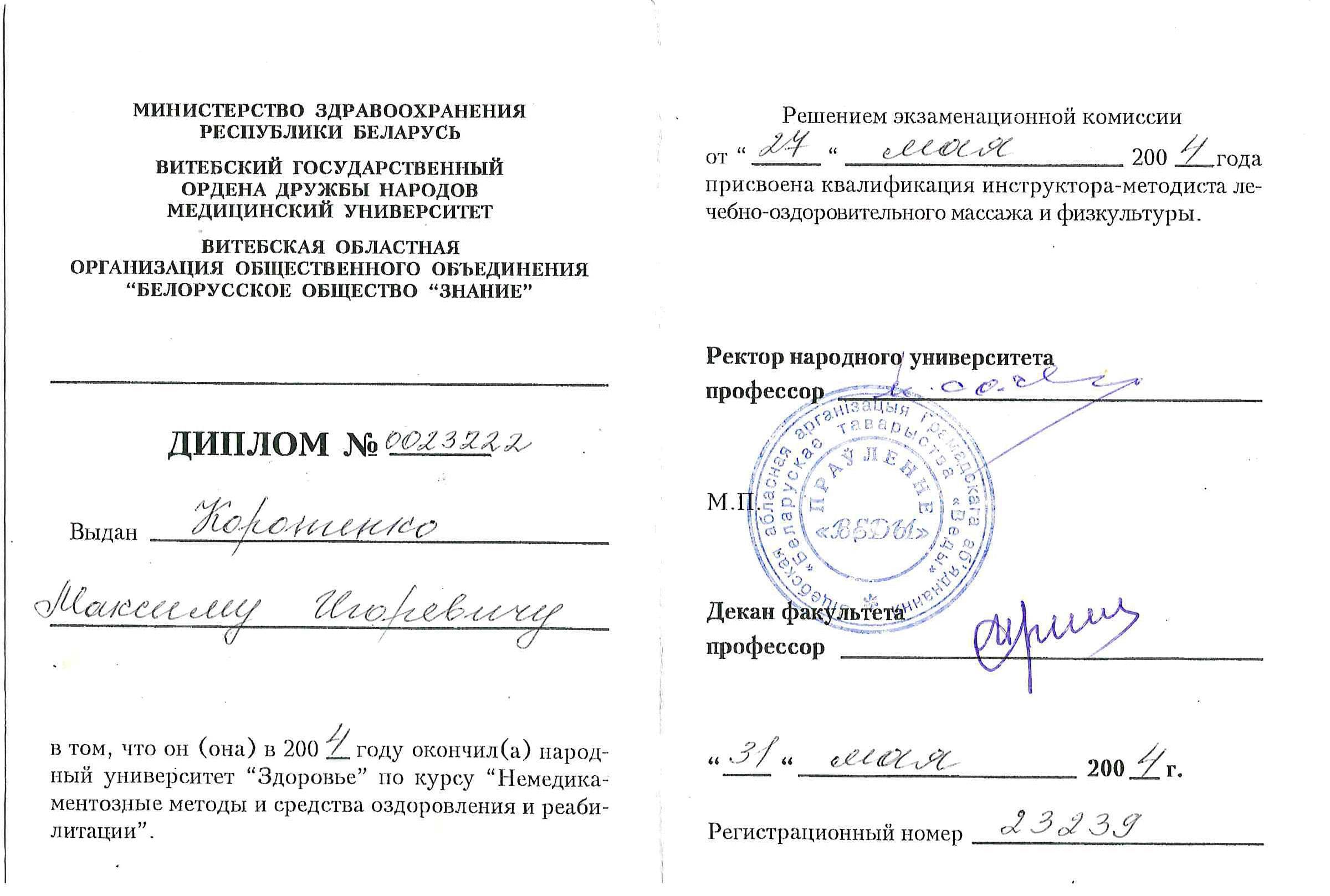 В 2004 году окончил обучение на базе Витебского государственного медицинского университета и получил специальность «Инструктор-методист лечебно-оздоровительного массажа и физкультуры».