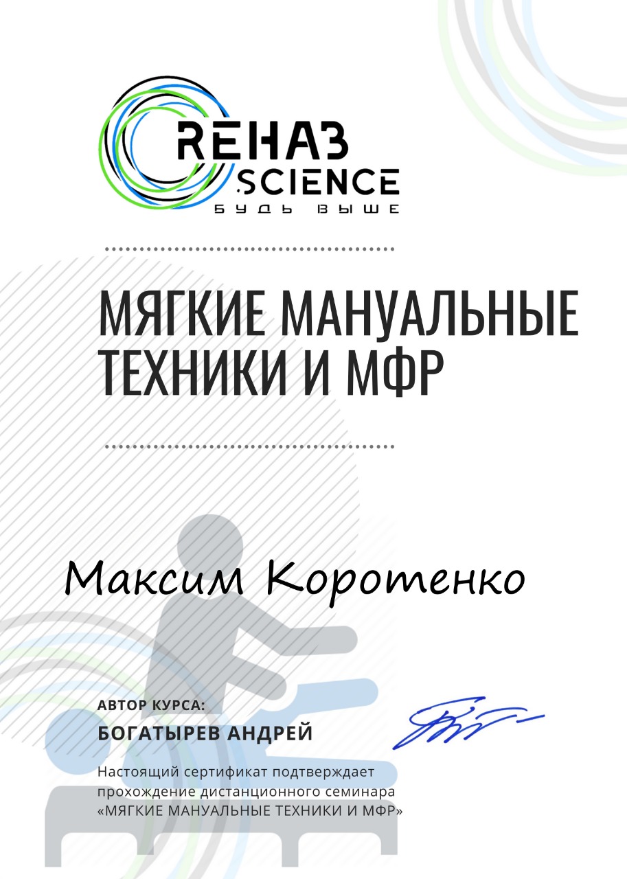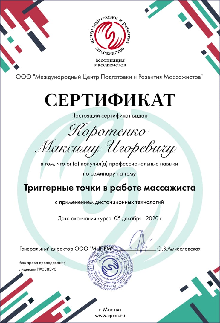 - Сдал квалификационные экзамены для вступления в Ассоциацию массажистов ЦПРМ.