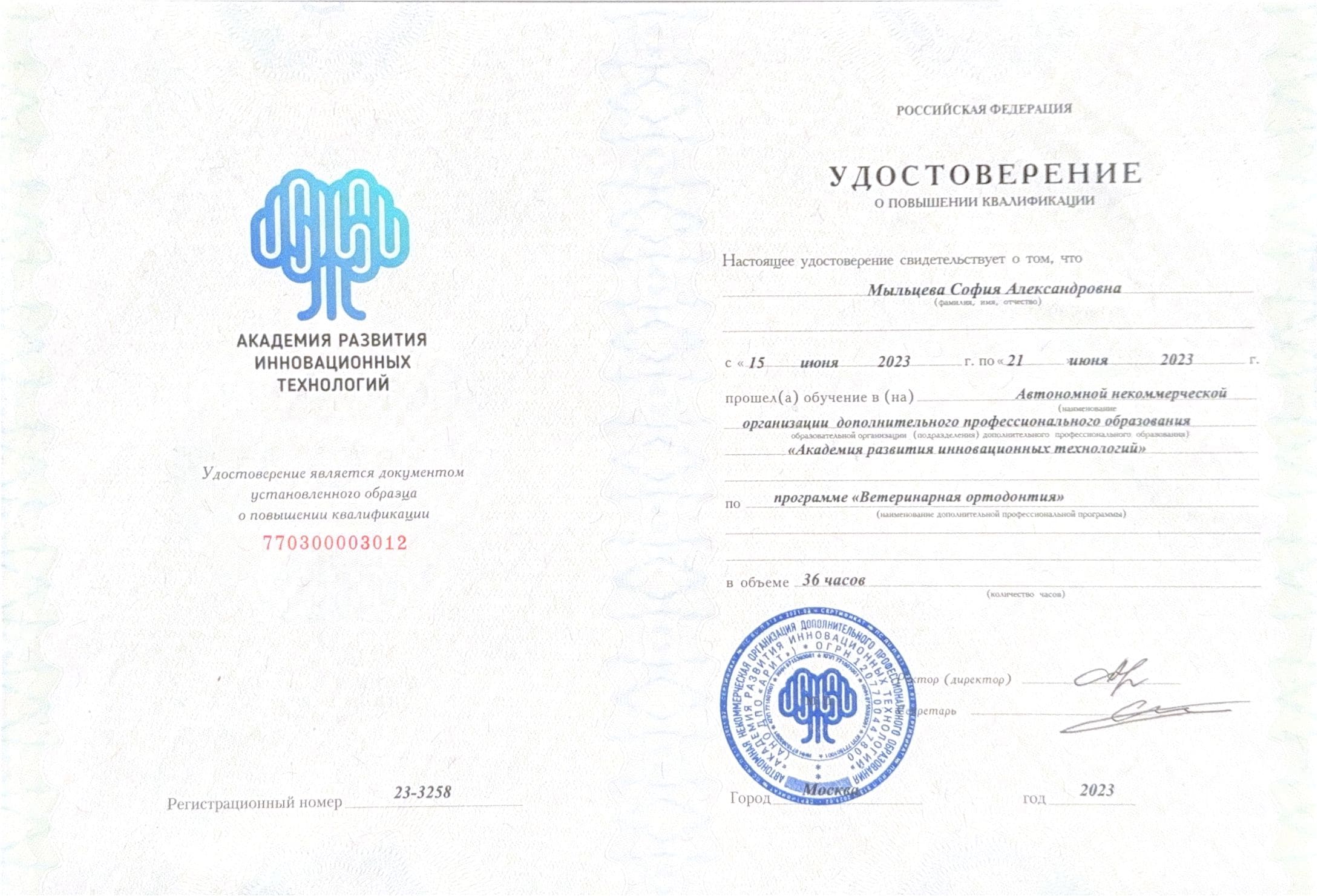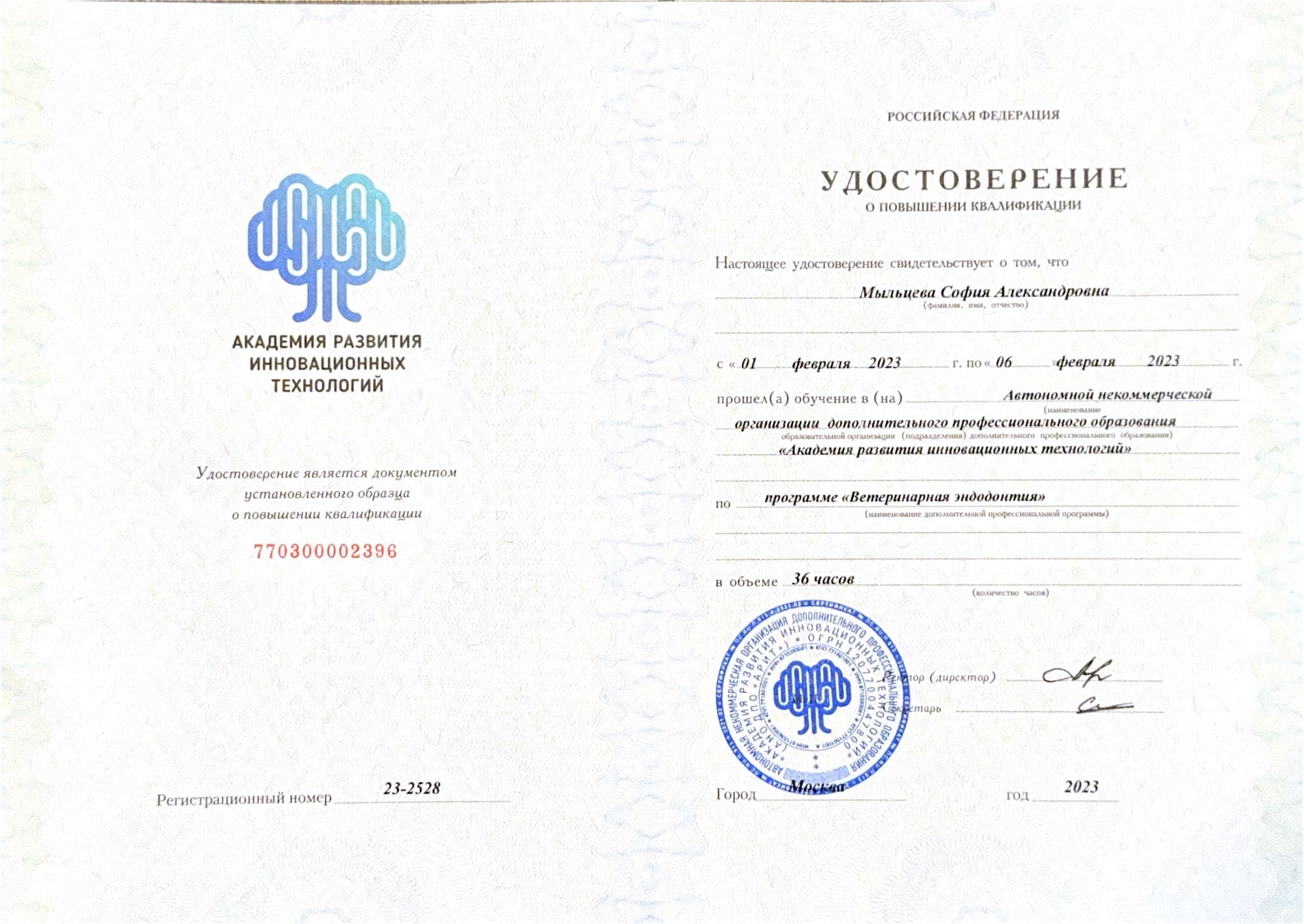 - Повышение квалификации «Ветеринарная ортодонтия» (руководитель Куприенко С. В.).