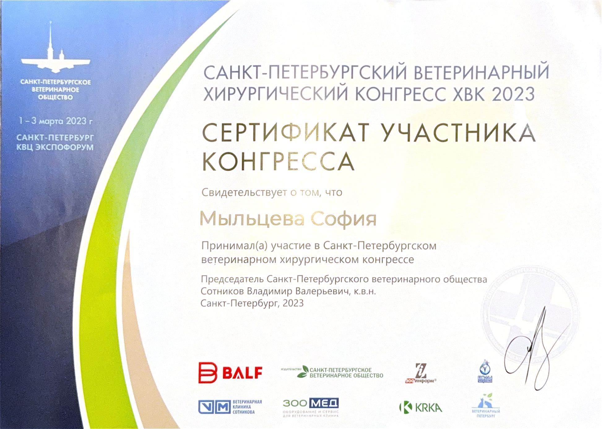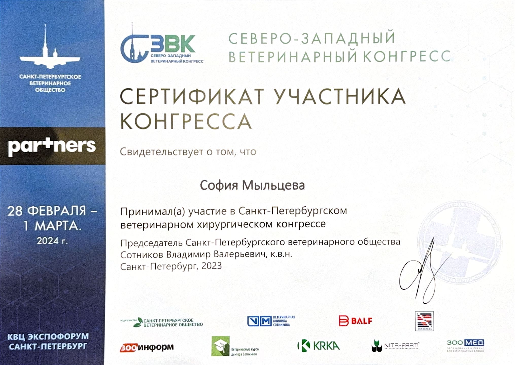 - Участник Санкт-Петербургского ветеринарного хирургического конгресса.