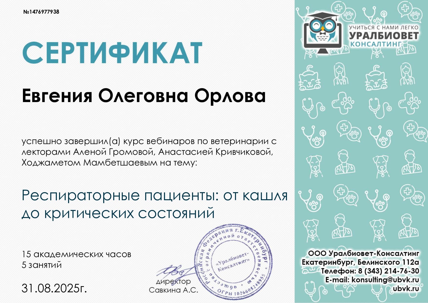 - Курс вебинаров на тему «Респираторные заболевания собак и кошек» (лектор Юлия Диденко).