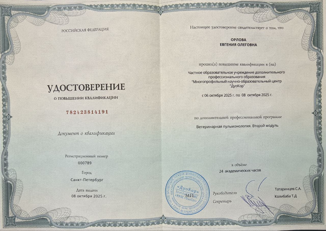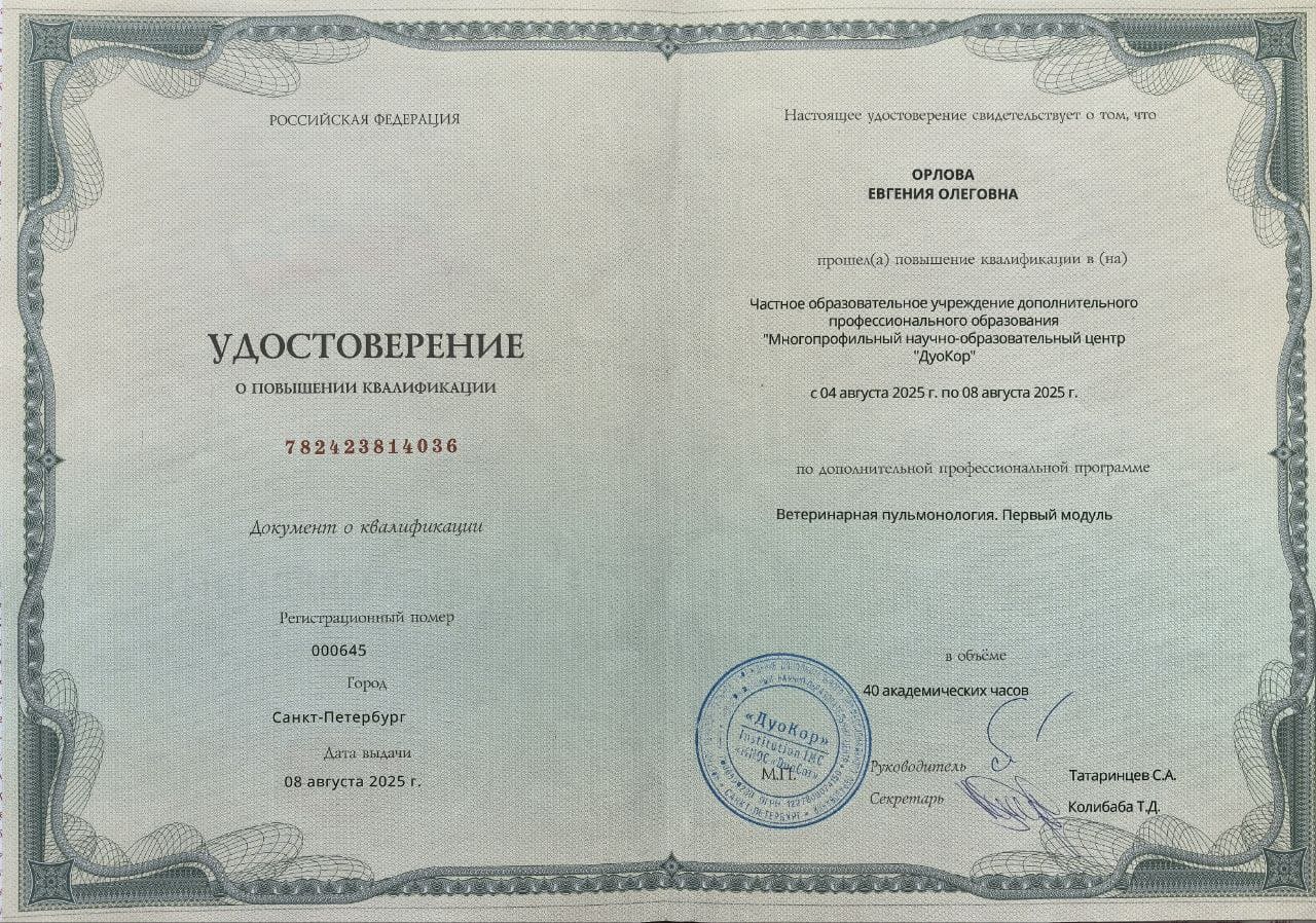 С октября 2025 года — врач-кардиолог, пульмонолог в ветеринарном центре «Зоостатус».