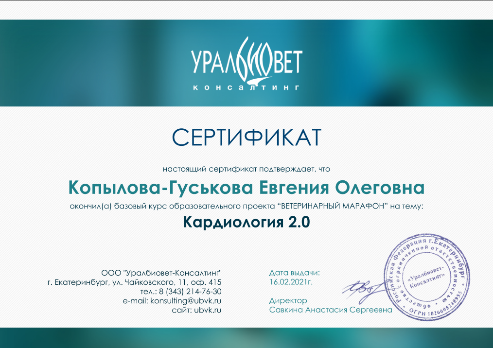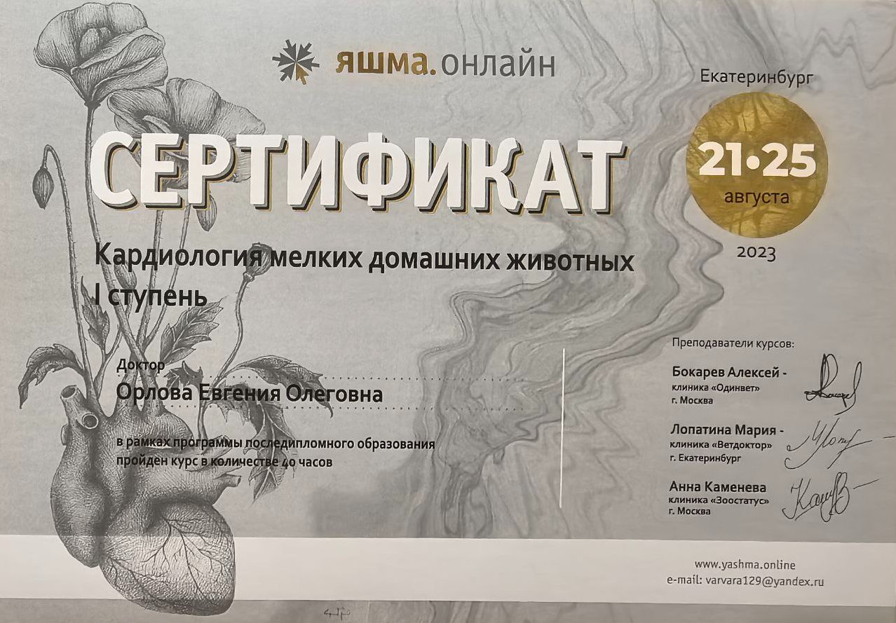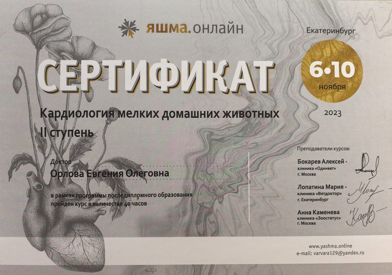 - Очный курс по кардиологии мелких домашних животных, 2 ступень (40 часов) на базе образовательного центра «Яшма.онлайн» (лекторы Бокарёв А. В., Каменева А. В., Лопатина М. Ю.).