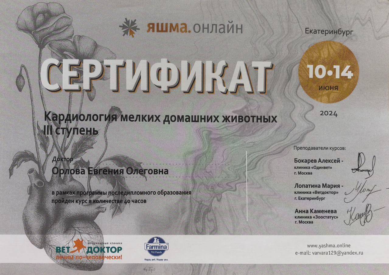 - Очный курс по кардиологии мелких домашних животных, 3 ступень (40 часов) на базе образовательного центра «Яшма.онлайн» (лекторы Бокарёв А. В., Каменева А. В., Лопатина М. Ю.).