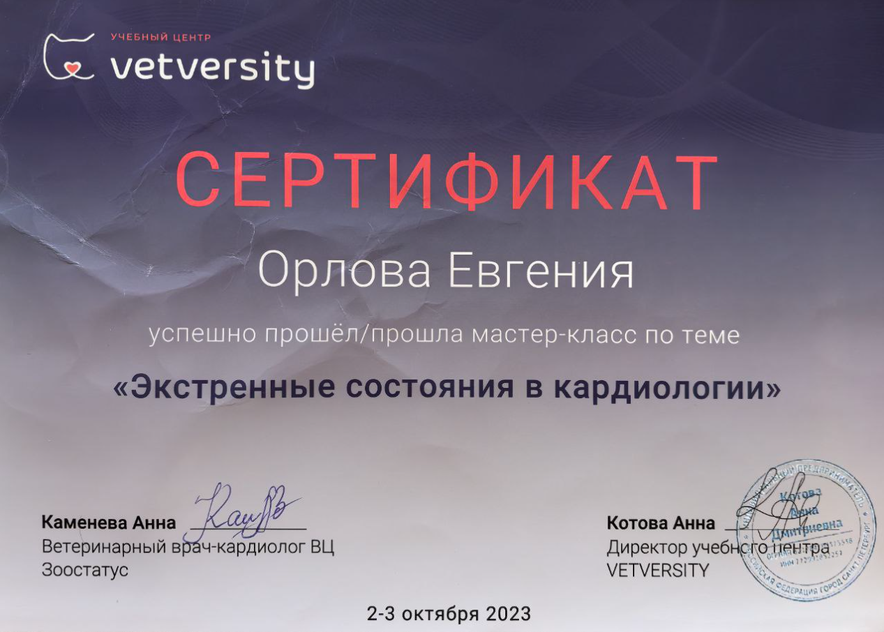 - Мастер-класс от учебного центра Vetversity «Экстренные состояния в кардиологии» (лектор Каменева А. В.).