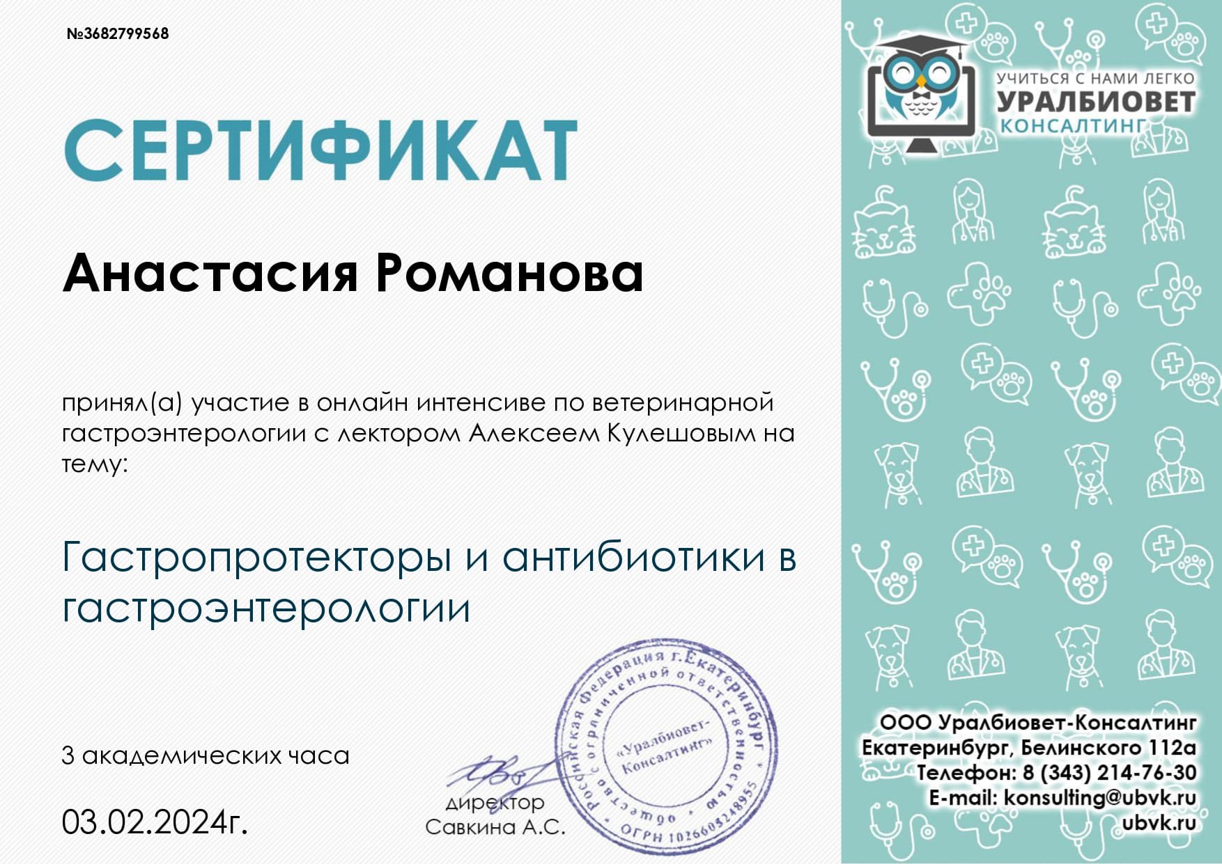 - Онлайн-интенсив по ветеринарной гастроэнтерологии «Гастропротекторы и антибиотики в гастроэнтерологии» (учебный центр «Уралбиовет»).