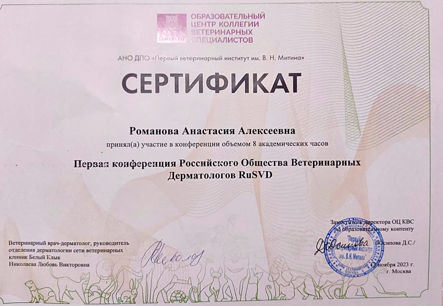- Участник первой конференции Российского общества ветеринарных дерматологов RuSVD (АНО ДПО «Первый ветеринарный институт им. В. И. Митина»).