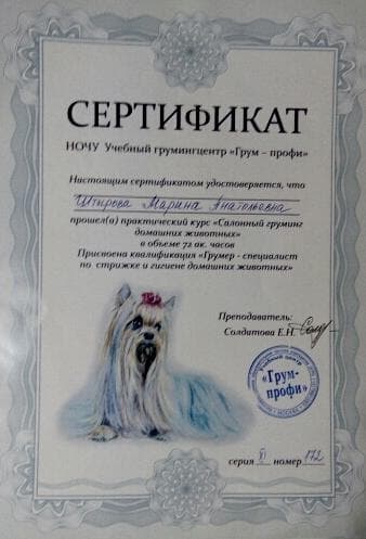 В 2015 году закончила обучение в школе груминга ГРУМ-ПРОФИ.