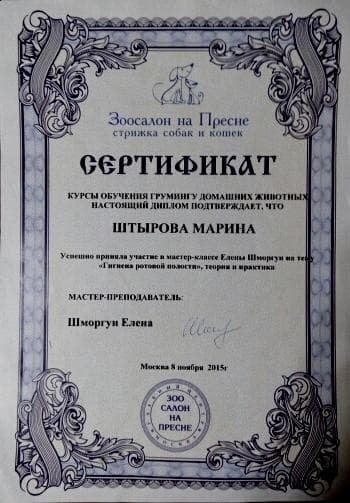 - Участие в мастер-классе по грумингу «Гигиена ротовой полости: теория и практика» (руководитель Шморгун Е.).