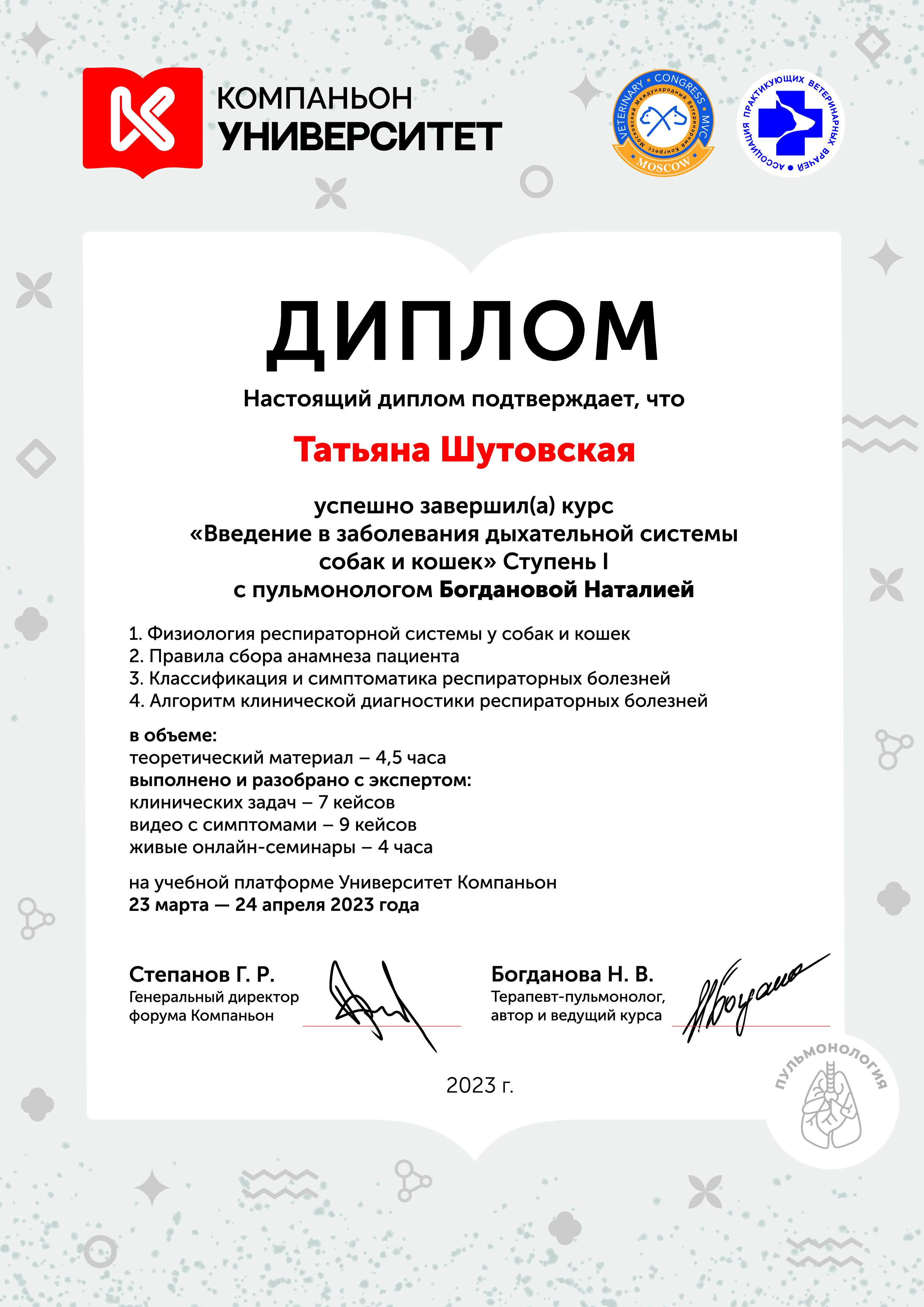 - Первая ступень курса «Введение в заболевания дыхательной системы собак и кошек» с пульмонологом Богдановой Н. В. на учебной платформе «Университет Компаньон».