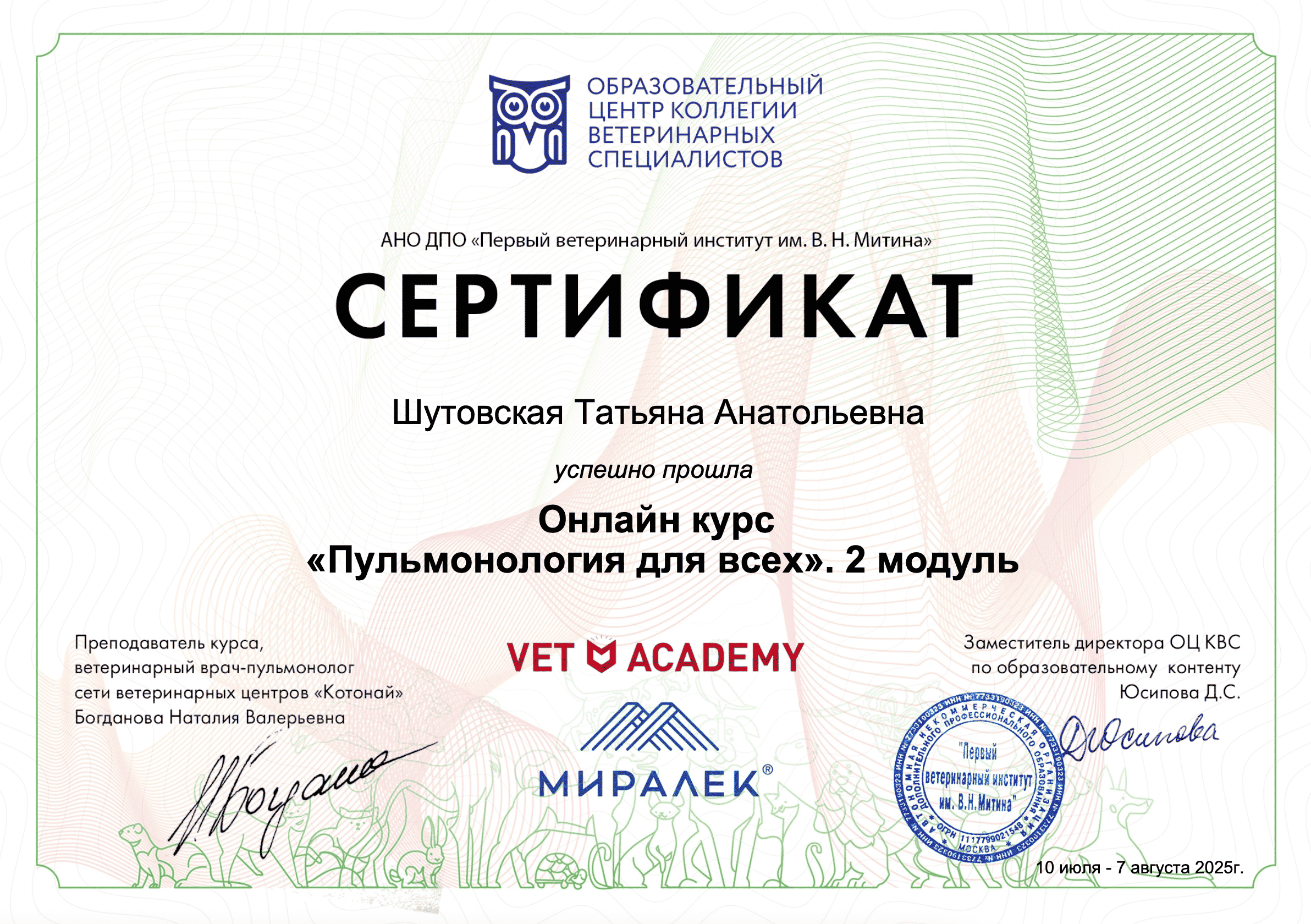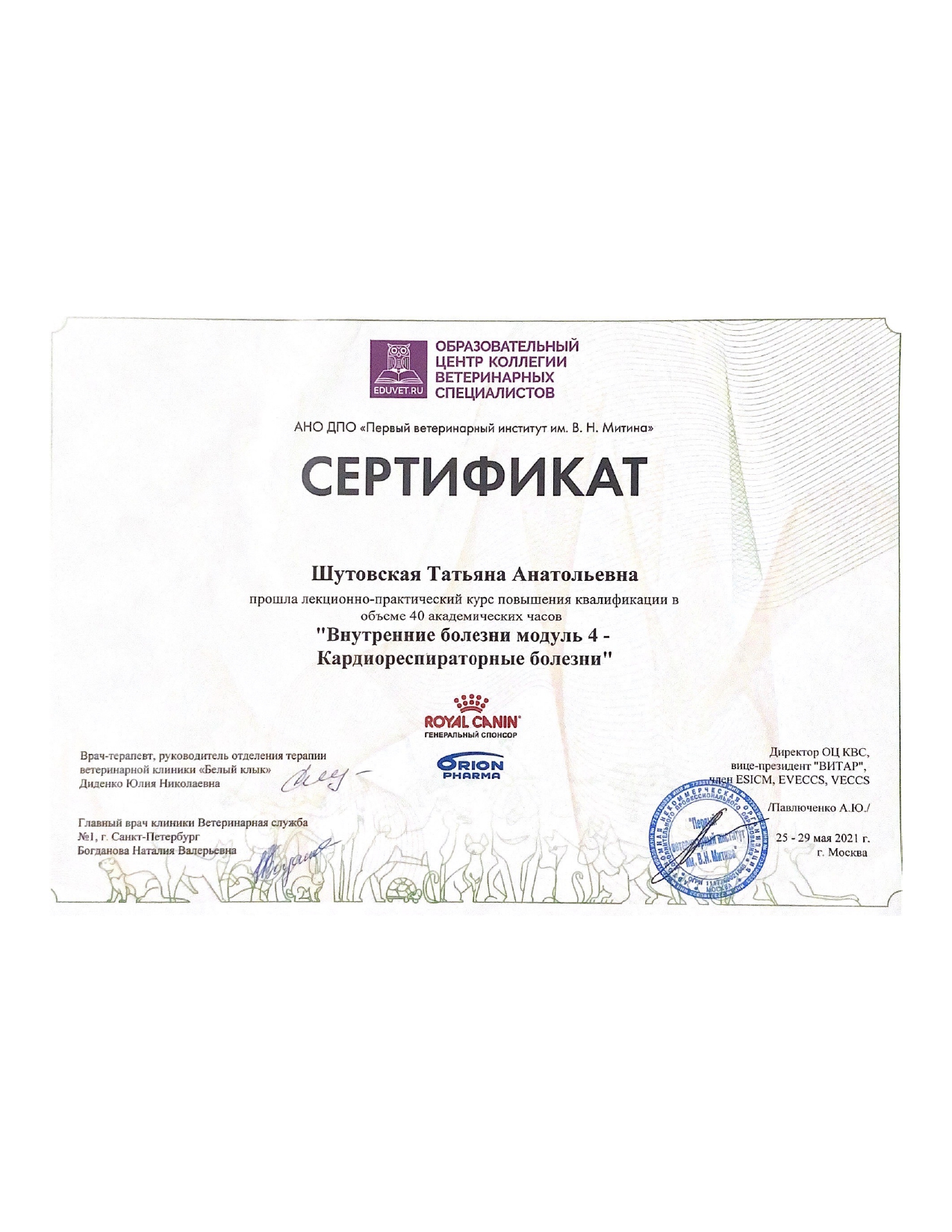 - Курс «Внутренние болезни, IV модуль — кардиореспираторные болезни», АНО ДПО «Первый ветеринарный институт им. В. И. Митина».