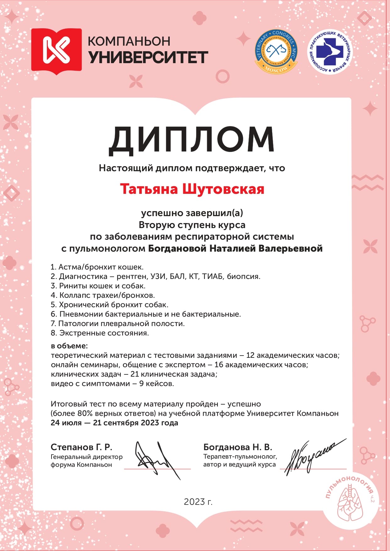 - Вторая ступень курса по заболеваниям респираторной системы с пульмонологом Богдановой Н. В. на учебной платформе «Университет Компаньон».