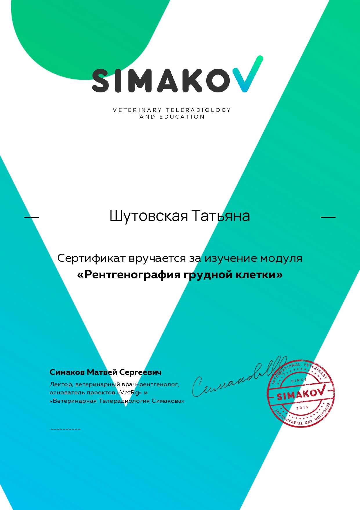 - Онлайн-курс «Пульмонология для всех», модуль 2 в АНО ДПО «Первый ветеринарный институт им. В. И. Митина».